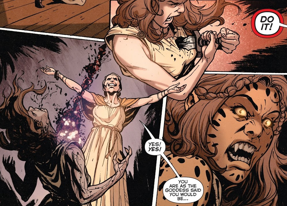 n主线中曾出现过四代豹女,重启前豹女只是穿着豹皮装的罪犯,后来设定为被猎豹女神附身的半人半豹。n