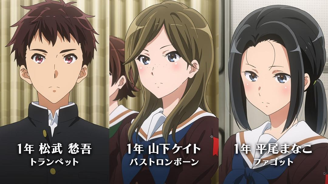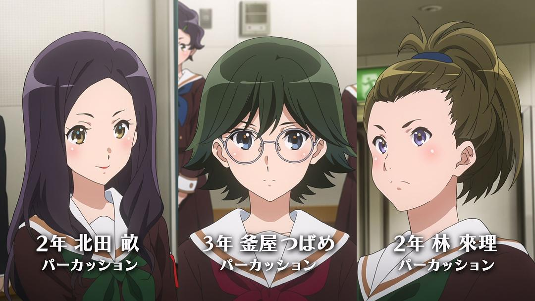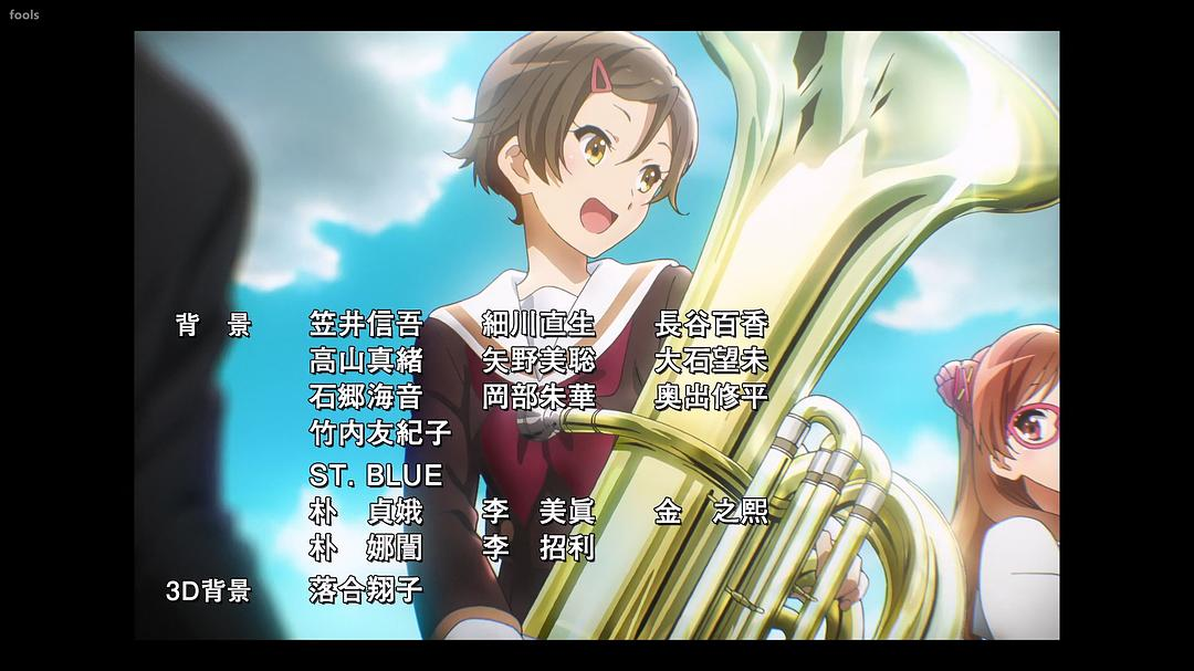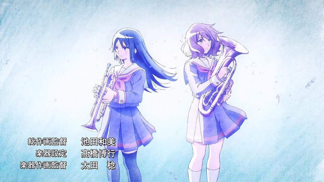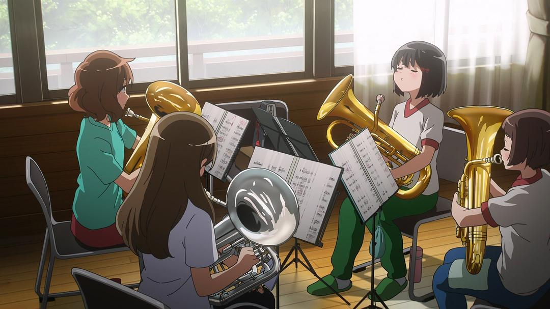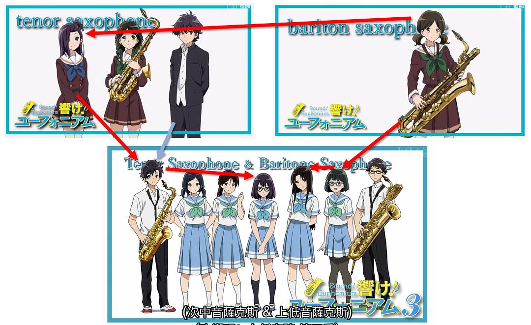 第10集至第12集的过场分别是上低音号、大号、低音提琴组,在编组上合编为低音声部,虽然不太严谨,但也合情合理、便于管理。众所周知,整个系列的女主角黄前久美子以及她的两个同年级好友小绿和叶月都在这个声部,所以声部里各届的部员大家也都非常熟悉了。另外,武田绫乃似乎也很偏爱这个声部,进而延伸到铜管乐器(即日本习惯称呼的金管乐器)范围,北宇治吹奏部的管理层常常出现在此。最后,这个声部也是卧虎藏龙,有来自初中名校的琴魔大佬、有低调支撑团队的大哥大嫂、有刚入门就进正选的新人、也有机械降神的转校生……老实说这声部但凡能管好自己的事,就已经是给整个吹奏部帮大忙了(苦笑)。