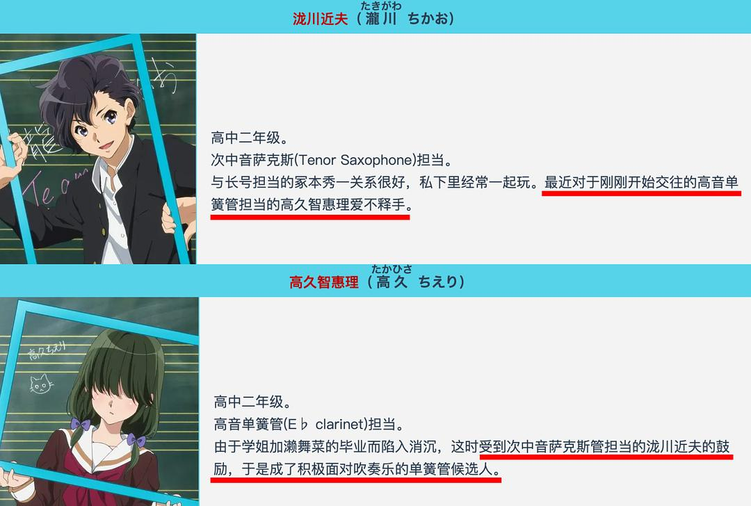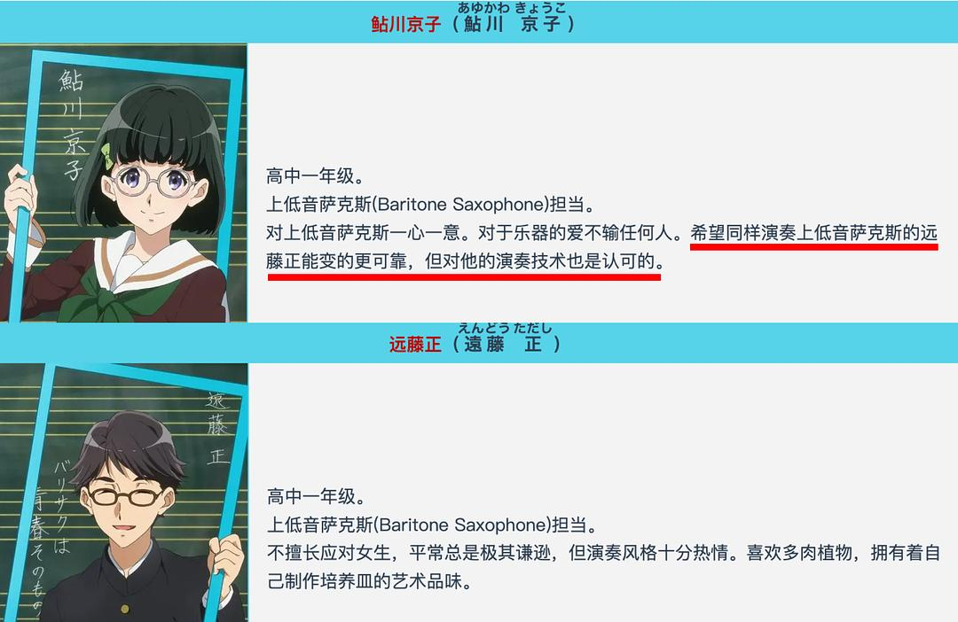 我在重温这个系列动画时,注意力渐渐从久美子一行主角团身上,渐渐发散到吹奏部其他声部、其他声部的其他角色上,换着角度去看,又会获得别样的乐趣。无论如何,京阿尼原创、塑造了许多原作里没有的高人气配角,而我想把这些配角的一些闪光的、或有趣的部分分享给大家,因此写这篇文(以及长笛声部的那篇文)时非常开心。