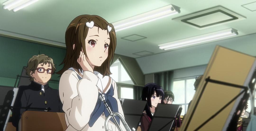 前文分析第四代声部长时已提过,在久二年正赛就担当定音鼓重任的东浦心子是最有力的候选。从本集过场站位也看出,乖巧的心子离三巨头最近,一副沉稳的神情已然有接班井上顺菜的感觉,吹奏部独一份秋季校服外搭小背心,也给人“声部长的贴心小棉袄”的感觉。