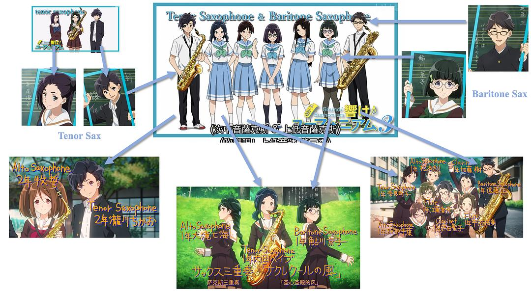 - 吹响吧!上低音号 系列动画n- 吹响!上低音号/第二年吹奏乐部成员介绍. 萌娘百科. 2024.n- 吹响!上低音号/合奏比赛队伍介绍. 萌娘百科. 2024.n- 北宇治高校吹奏楽部. Pixiv. 2024. n- 劇場版 響け!ユーフォニアム~誓いのフィナーレ~ 新北宇治高校吹部紹介 | 京アニショップ!. Kyotoanimation official website. 2019. n- 北宇治吹奏部可视化吹奏合集. Bilibili, Quanta233. 2024.n- 京吹群像志. Bilibili, 梓川楓かえで. 2024. n- 【吹响吧!上低音号】盘点北宇治吹奏乐各声部历史第一阵容. Bilibili, 梓川楓かえで. 2020. n- 【吹响吧!上低音号】盘点谁是北宇治吹奏乐部的刺头王. Bilibili, 梓川楓かえで. 2020. n- 京吹合奏比赛系列. Bilibili, 缨花香の小米. 2024. n- 京吹姓名标注系列. Bilibili, 缨花香の小米. 2023.n- 合集·吹响吧!上低音号3. Bilibili, 缨花香の小米. 2023.n- 爆肝!京吹动画中121名角色的总戏份排名. Bilibili, 龙宁缔造者. 2024.n- 【三年大赛 五次选拔】北宇治历届正赛编制一览. Bilibili, Glucose葡萄糖. 2024. n- 響けユーフォニアム登場キャラクターまとめ. 油管, Mr.かたくなる. 2024. n- 京阿尼人物志. Bilibili, 京阿尼语料. 2024.n- 京 吹 宇 宙. Bilibili, Joker冬瓜. 2024. n- 京吹1,各乐器のBb. Bilibili, 很阅. 2021.n- 京吹2过场,各角色的音阶. Bilibili, 七方禁行. 2022. n- 吹响上低音号 久一年吹奏乐部成员明细. Bilibili, A罗歪. 2021.n- 从久二年出场阵容试析得废金的原因. 吹响次中音号吧, 80th_fan. 2022. n- [自制字幕]利兹与青鸟-山田尚子-访谈. Bilibili, Consuegra. 2020. n- 【熟】利兹与青鸟:声优评论音轨Part1【種崎敦美×東山奈央×藤村鼓乃美×山岡ゆり】. Bilibili, 南條愛乃_Official. 2023. n- 《利兹与青鸟》拉片解析. Bilibili, Gloxxa. 2024. n- 【合奏比赛篇】组队名单及比赛结果. Bilibili, 广濑康穗_Official. 2023. n- 【吹响吧!上低音号】小说合奏比赛曲目合集. Bilibili, 价值6个硬币的昵称233. 2022. n- 北宇治高中吹奏在久二年的大赛成绩分析,如何问责?. Bilibili, 京阿尼语料. 2020.n- 【长笛三重奏】月光所照亮的三片风景 フルート三重奏曲 月明かりの照らす3つの風景 高橋宏樹作曲. Bilibili, 帮滂并不明白. 2023. n注:被引作者如认为引用有任何不妥,请联系我修改或删除,感谢!