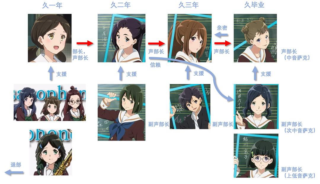 再来看图中下半部的新生指导。这个职位是在久二年才出现的,由加部友惠带着久美子进行。因为要大量接触新生,所以是个需要细心、耐心且有一定“手段”的工作,反过来看,也能让自身在新生间快速积累大量人气。所谓“了解你的部员,让你的部员了解你”、“从部员中来,到部员中去”。久三年,随着久美子当选部长,这个位置也让人们浮想联翩,觉得是不是下一届的部长候选,也得到这里来历练历练?那么久三年新生指导安排叶月带梨梨花,似乎就别有深意了。