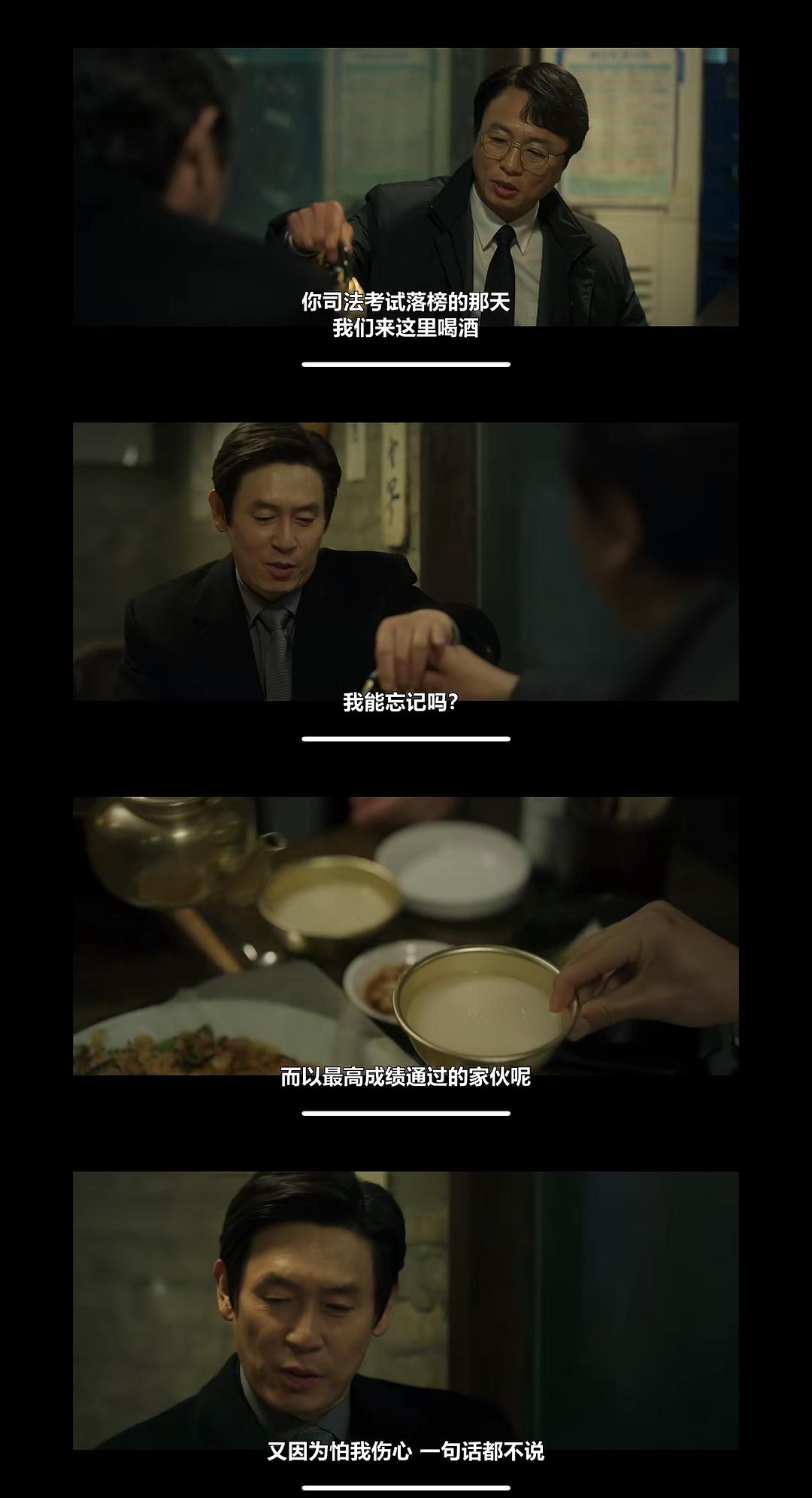 这种生硬的剧情推进方式的快节奏,确实让角色利落了很多,但也让各种反转的情绪铺垫非常单薄。真实世界人物要做这么多重大的选择,需要的无数顾虑、纠结、权衡,都在一句句爽快的台词中消失了,包括朴东浩在设定里是有老婆孩子的,但只在别人嘴里出现过....郑秀珍的女儿就在被抄家时候出现了次,还有最后打电话让她妈看电视...