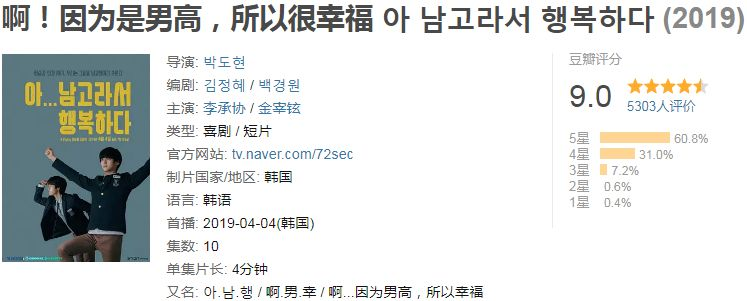 《啊,因为是男高,所以很幸福》类似于真人版《男子高中生的日常》,这部漫改剧非常短,全部看下来也只要30分钟。在这30分钟里,真实的给大家还原了当初的打打闹闹,互相拆台的高中生活,最真实的情节莫过于你和同桌在自习课上玩得正高兴,却发现你同桌突然打开了书认真的写写画画。当你想问他在干嘛时,回头却发现班主任在你身后看你很久了。