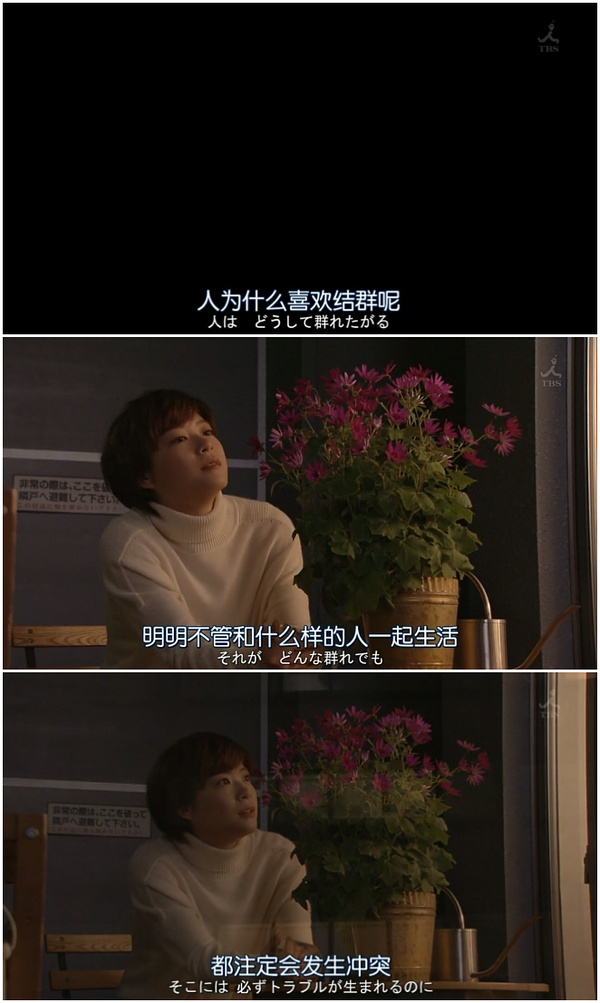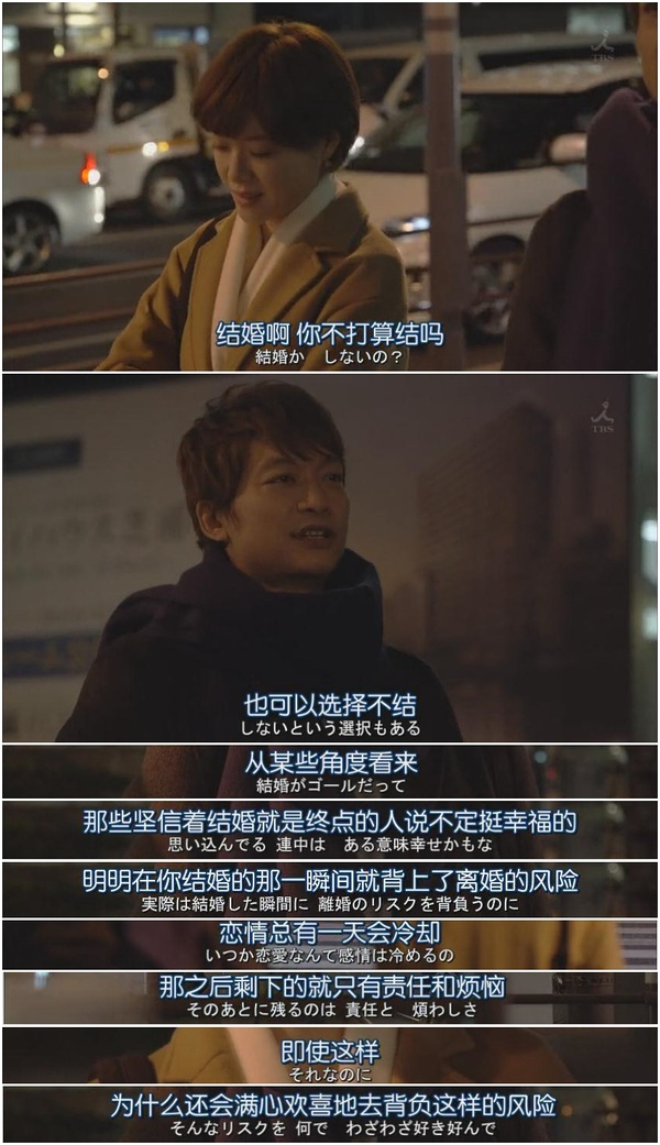 大介也是在长辈们的影响下慢慢的改编了自己的一些想法,最后两人在一起绝对不是对现实低头、对婚姻妥协,大介确实有非常强的精神洁癖,不对别人敞开心扉,之前一直标榜不婚,是没有遇到那个能让自己打开心扉的人,通过和叶菜子的不断接触磨合,两人都发现对方是最合适的在一起的人,“一生中或许再也遇不到这么合拍的人了,这或许只是一个小小的奇迹”,有什么理由不去珍惜呢?原先如此封闭的两人都可以坦诚相对,而作为观众的我们又何尝不行呢,何必要封闭一直,刻意不和别人建立联系呢?这是我觉得这部剧要表达的最重要的东西。
