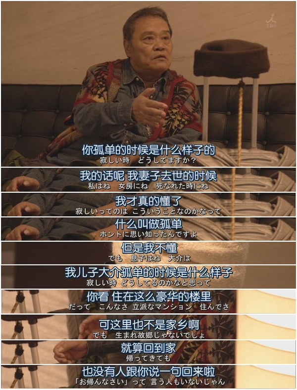 n上面这些台词我都表示强烈赞同,十分感同身受,微博上也被大批新年时被家长逼婚的人民热转,但剧名是《家族的形式》,日剧最注重是人与人之间的羁绊,尤其是家人之间,这部剧最主要的不是男女主角的恋爱剧情,而正是这个人与人之间的羁绊。老戏骨西田敏行饰演的父亲角色是联系所有人羁绊的重要的纽带,他的许多说教台词也同样让人印象深刻。