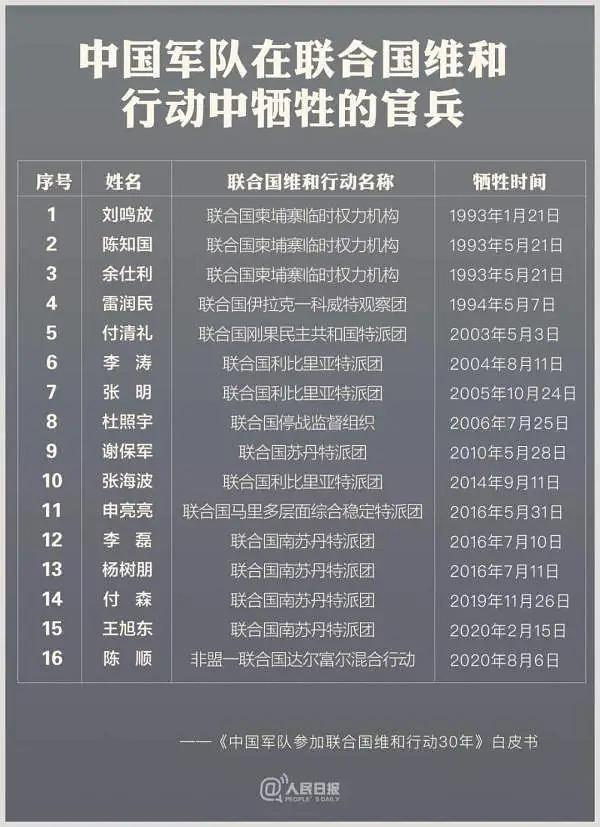 在维和行动中,先后有16位中国军人为了崇高的人类和平事业而献出了生命。