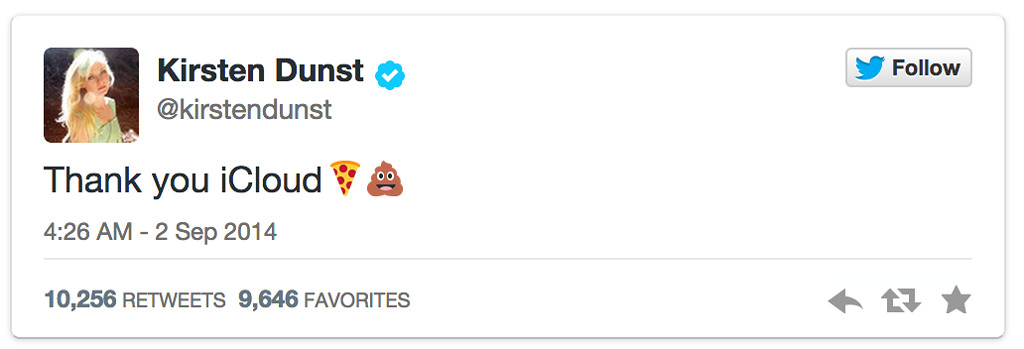 克斯汀·邓斯特却不走寻常路,非但没表达愤怒,还发文感谢iCloud,讥讽对方的安全性名不副实。