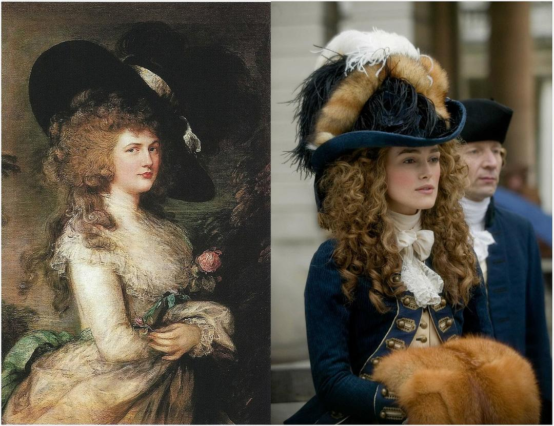 ©️左图为画家托马斯·庚斯博罗1787年作品,名为《乔治亚娜,德文郡公爵夫人》,现藏于德文郡大宅。右图为[公爵夫人]剧照,在那个女性没有投票权的时代,乔治亚娜的所作所为十分超前