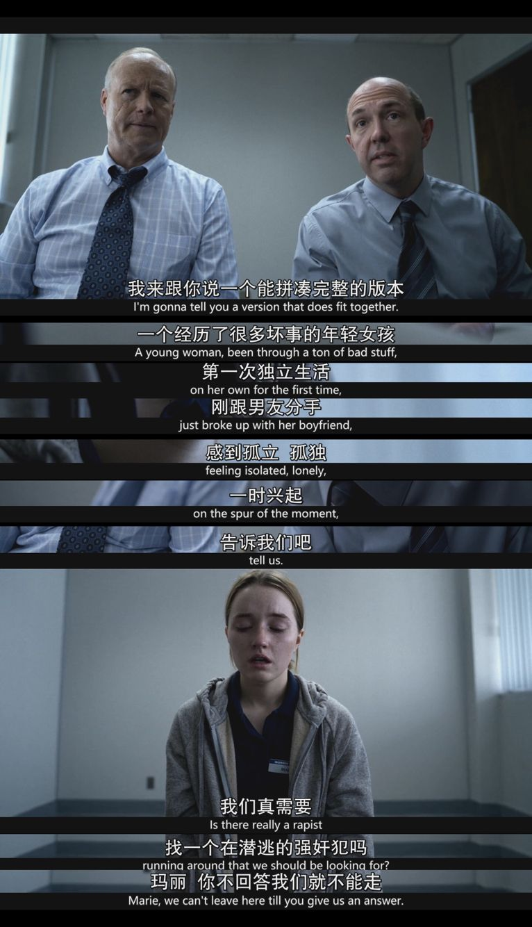 《Unbelievable》始终聚焦于受害人本身,从性侵、报案、遭受质疑、说谎,到夺回真相、捍卫权利,Marie的意志始终以主体地位贯穿始终,可以看到完整的心理图式变动。