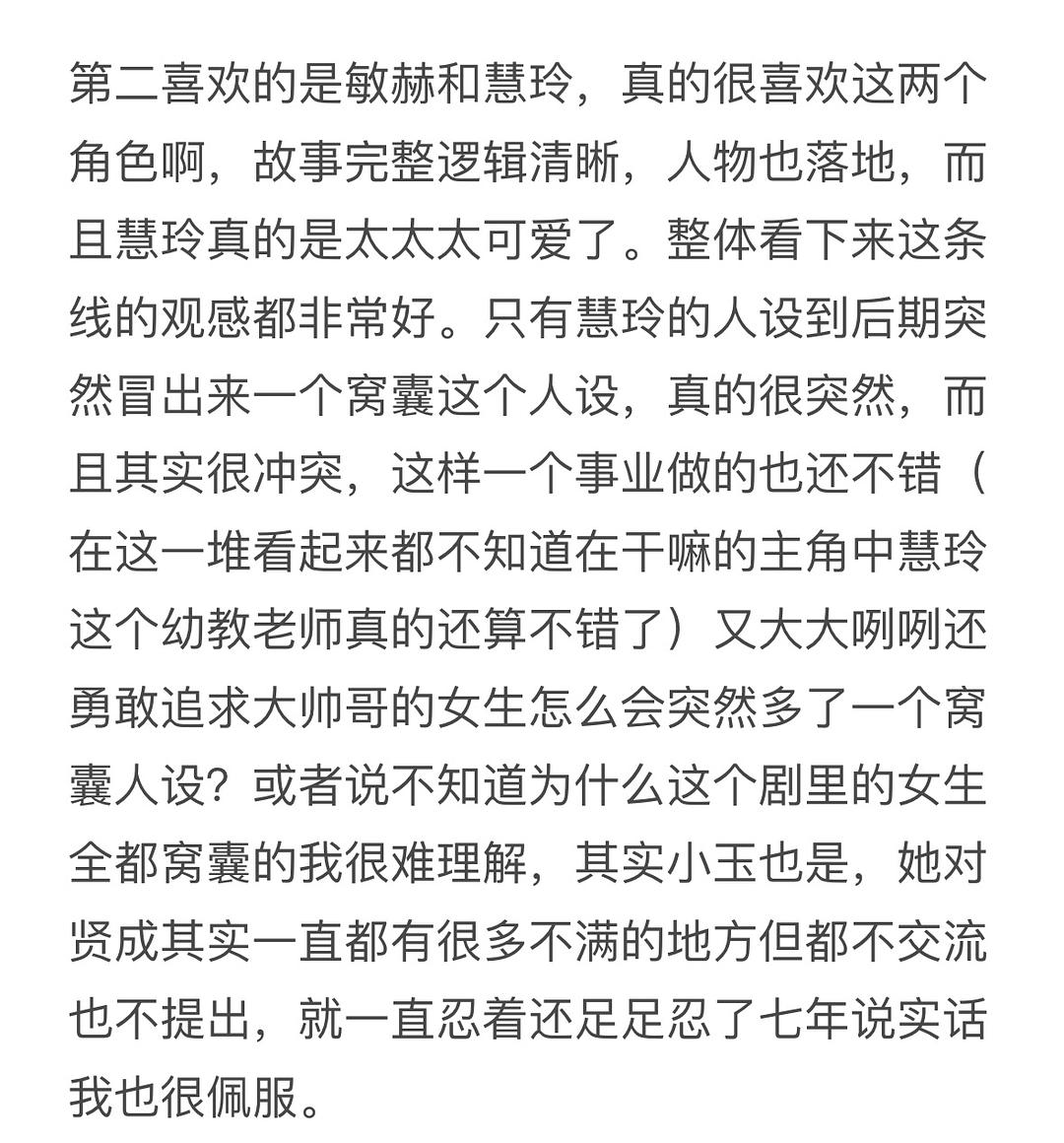 建烨更是极品工具人角色,他从一出场就一副格格不入的感觉,其他所有人不论是讨喜还是讨厌都是比较有活人感的角色,只有他从头到尾都非常悬浮,完全不落地。全程用力过猛的追求着小玉。我没有觉得他对小玉产生了什么感情上的影响,他只是为小玉提供了一份工作,小玉的每一步决定也和他没什么关系。而且他这个角色真的是让人越看越迷惑,看到最后甚至开始怀疑他不是喜欢小玉,而是贤成的深柜好吗?谁会在追求女生的时候三句不离这个女生的前男友啊这不是有病吗?说实话如果不是他总提来提去没准小玉走出来的还更快,导致我一度看到这个角色就心烦。直到结局小玉开了自己的工作室,所有事都结束了的时候他真的一毛戏份都没有,我开始对他怜爱了,因为他工具人的太彻底了,为什么这个剧里会有如此工具人的一个角色。