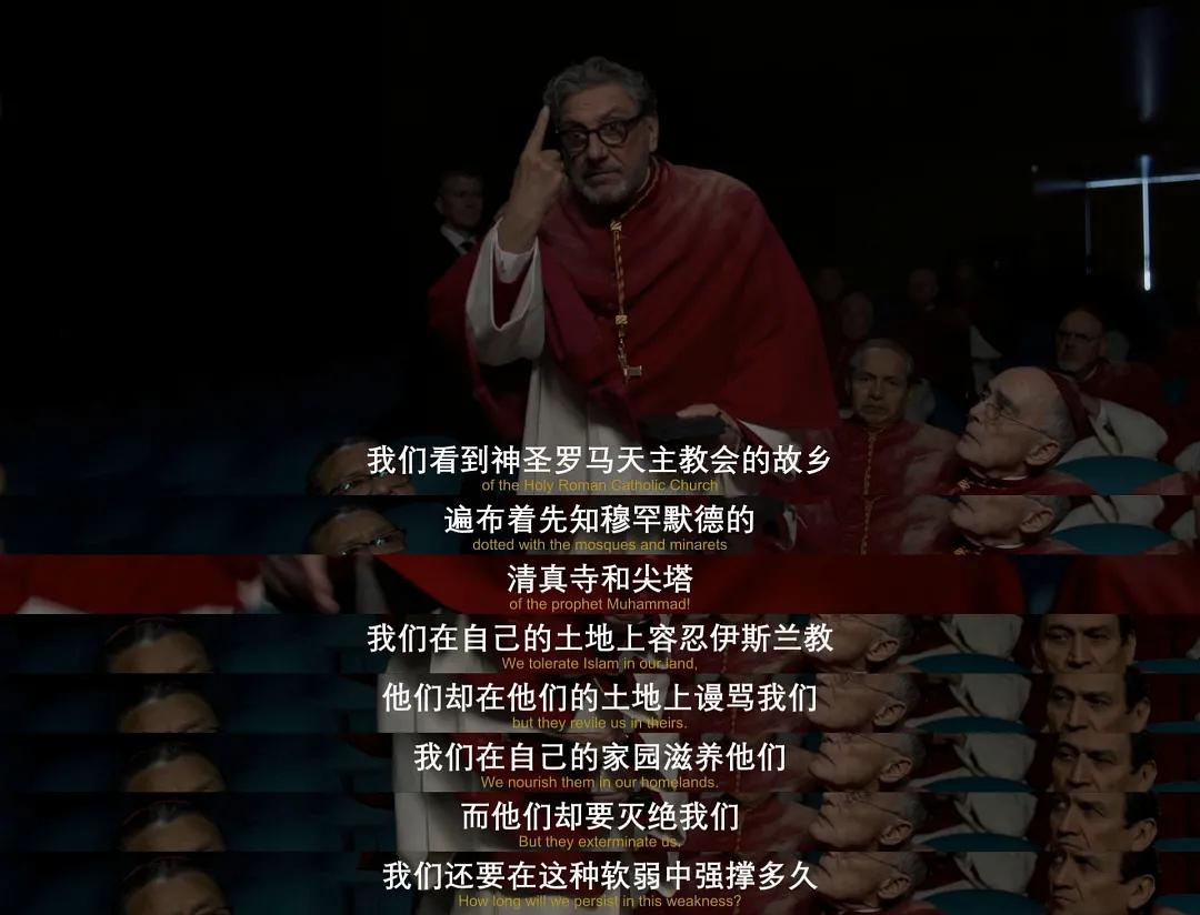每个镜头都快速闪过,休闲的主教与打杂的修女,暖黄的社交场面以及阴冷的工作场所。这一切都让作为女性观众的我非常不适。n金毛问我: which do you think is worse, government or church?(你觉得政府和教堂哪个更糟?)n我:It doesn’t matter which party it is, power is filthy. (哪一方都不重要,肮脏的是权力本身)n金毛:yet everyone has faith in God. (不过每个人都信上帝)n我: And God stands by patriarchy. (然后上帝支持父权制)nn另外,对女性议题上的不同观点也体现了电影里不同主教的人物性格。作为保守派的意大利主教Tedesco固执排外,想引领社会回到规章严谨的传统年代,精神纳粹自然不会给女性相应的地位和权利。而自由派的代表Bellini主教尊重其他信仰并且认为女性应该在教廷发挥更大的作用,却在说这话时驱赶了在场的修女。一切口号式的主张都只有党同伐异这一个目的。就连与人为善的黑人主教Adeyemi三十岁时与十九岁的修女剩下孩子,在选举当下更是翻脸无情,毕竟在他眼中这只是过往的一个小小污点。男权社会里,女性没有足够的发言权,教廷就是一个微型缩影。对此修女艾格尼丝有一句振聋发聩的台词:n“ Although we sisters are supposed to be invisible, God has nevertheless given us eyes and ears.”(虽然我们修女应该是隐形的,但上帝却还是给了我们眼睛和耳朵。)nn当这些零星埋伏在剧情中的不适渐渐汇聚成塔时,终于在结局的反转中迎来爆发。得知新教宗的体内有女性子宫和卵巢时,震惊之余,眼泪先流了出来。我突然理解了之前所有的铺垫。主教Benitez 在战争期间给刚果遭受种族灭绝性暴力的女性受害者建立医院,并且在教廷为餐点祈福时说了大家都意想不到的话:n“ Bless all those who cannot share this with us and help us, oh lord, as we eat and drink, to remember the hungry, the thirsty, the sick and the lonely and the sisters who prepared this food for us. Through Christ Our Lord. Amen.”(请保佑所有不能与我们共享这一餐的人,并在我们吃喝的时候,帮助我们记住饥饿、干渴、生病和孤独的人以及为我们准备这一餐的修女。通过我们的主耶稣,阿门。)nn而作为性少数者,他是不涉党争的中立人士,过往的经历更让他看到众生之苦。因此最后的剖白成了扭转选举局势的关键:n“With respect, what do you know about war? I carried out my ministry in Congo, in Baghdad, in Kabul. I have seen the lines of the dead and wondered Christian and Muslim. Would you say we have to fight? What is it you think we’re fighting? Do you think it’s those deluded men who had carried out these terrible acts today? No, my brothers. The thing you’re fighting is here , inside each and every one of us. If we give in to hate now, if we speak of ‘sides’ instead of speaking for every man and woman. This is my first time here, amongst you. And I suppose it will be my last. Forgive me, but these last few days we have shown ourselves to be small petty men, we have seemed concerned only with ourselves, with Rome, with these elections, with power. But things are not the church. The church is not tradition. The church is not the past. The church is what we do next. ”n(恕我直言,你们对战争了解多少呢?我在刚果开展传道工作,在巴格达,在喀布尔。我看到了成队的尸体,我想知道基督徒和穆斯林。你说我们必须战斗吗?你认为我们在争什么呢?你认为是那些痴心妄想的人实施了今天这些可怕的行径吗?不,我的兄弟。如果我们现在屈服于仇恨,如果我们谈论的是“阵营”,而不是为每个男人和女人说话,那么你们要对抗的东西就在我们每个人的内心深处。这是我第一次来这里来到你们中间,我想这也将是我最后一次。请原谅我,但在过去几天里,我们显示出了自己的小家子气,我们似乎只关心自己,只关心罗马,只关心这些选举,只关心权力。但教会的情况并非如此。教会不是传统。教会不是过去。教会是我们接下来要做的事情。)nn虽然大部分观众对于教宗的去处早有猜测,但镜头语言也明确给出了答案。下一任教宗坐在正中间,把党派和争论隔绝于两侧,光线只会落在他身上。