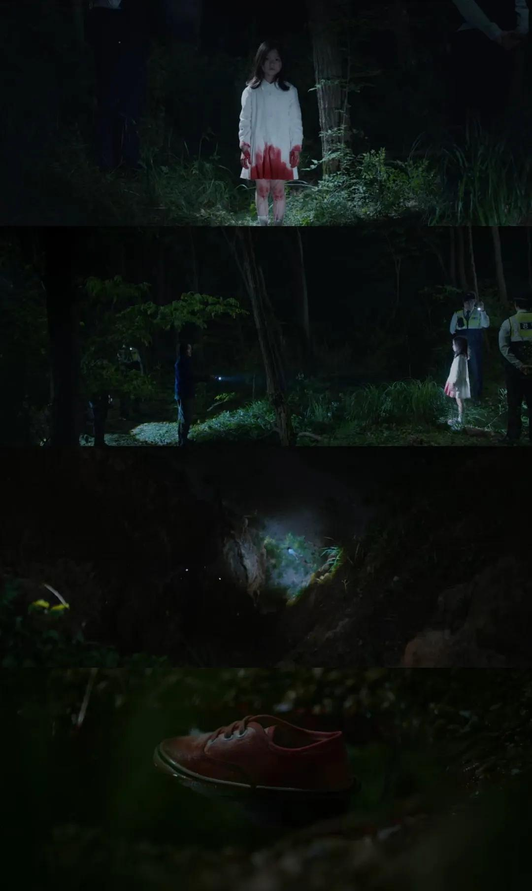 在回忆夏俊意外死亡的这场戏中,漆黑的山林中唯一的光源是手电筒,张泰洙也打着手电筒寻找姐弟俩,然后他发现了夏彬所在,光聚焦在夏彬沾了血的白色裙子,无疑是一个视觉冲击的画面。然后他停了下来,画面中间横亘着一棵树。接着就是山崖下模糊的身影,特写一只被血侵染的小鞋子暗示孩子死亡。
