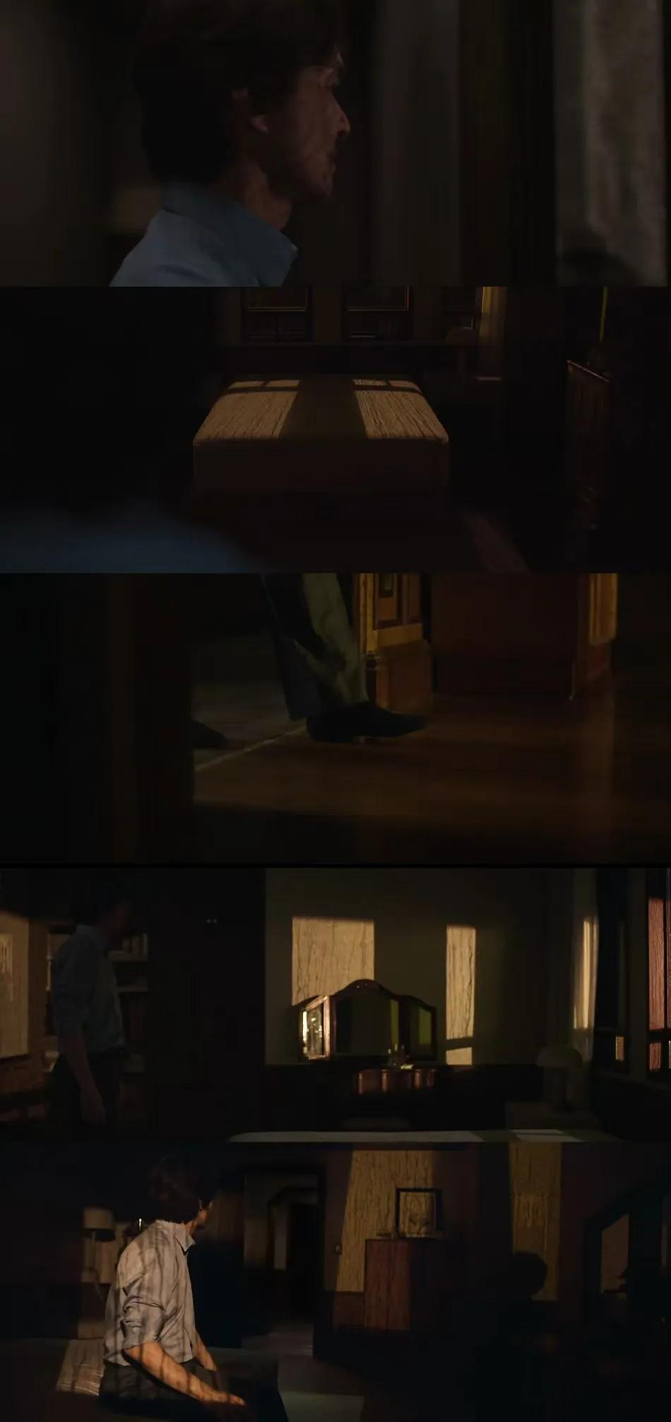 还有一个我很喜欢的镜头,同样的鸟瞰镜头加封闭式构图,不同的是,上图的构图呈现三角形,视觉上的尖锐度自带卡夫卡式的荒谬感,相对有戏剧性;但下图确实真实而压抑的,几乎完全黑暗的画面、方方正正的房子和走道,被长方形红色线条框住的影子像被囚禁在一个小小的棺材中。