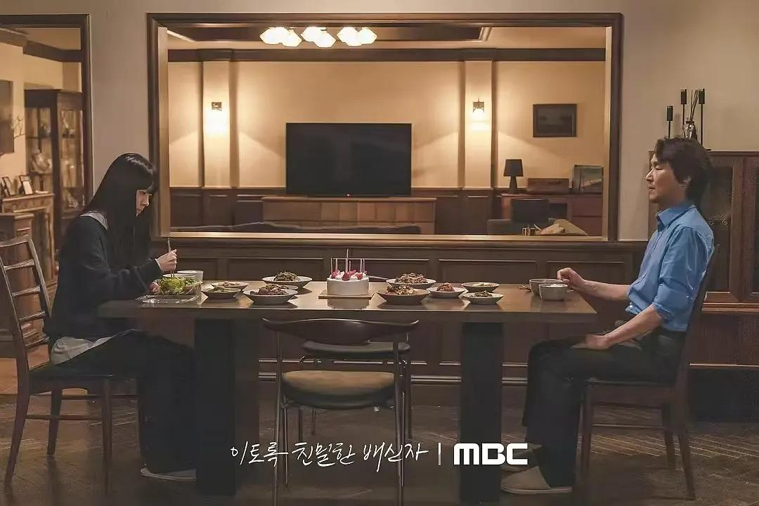 从第一集夏彬过生日,张泰洙准备生日餐,生疏的刀法、中间隔了一条银河的长桌、背景的隔断,都在交代父女关系之差。尤其家中隔断的空间设计,像极了审讯室······