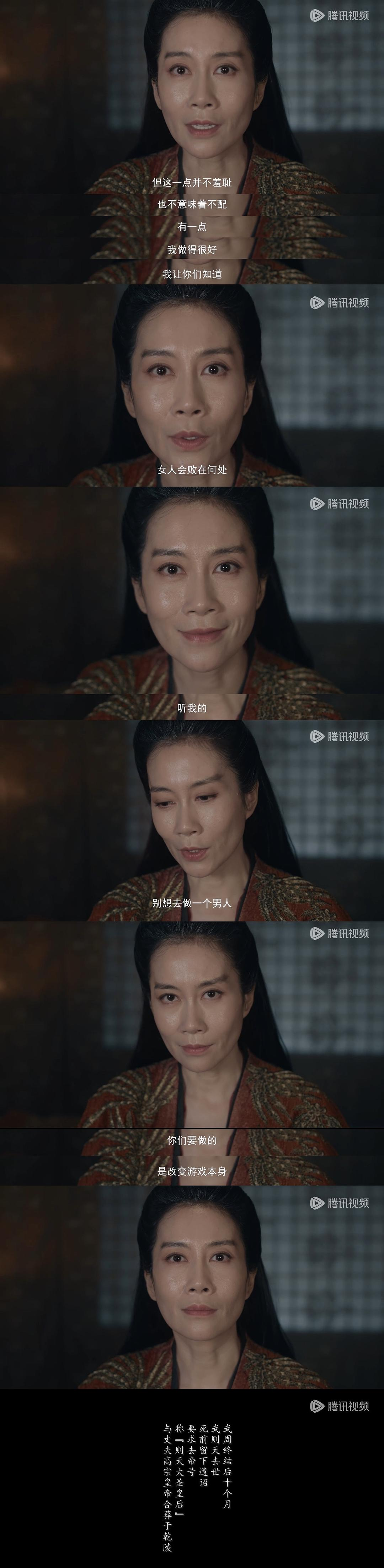 影视史上演绎武则天的有许多,刘晓庆的版本没看过,印象最深的还是《大明宫词》,而且剧里也不止武则天,围绕着武则天那个时代,那些灿烂辉煌的女人们,太平公主、上官婉儿、高阳公主、韦氏等等等等,刻画的更加细腻。而纪录片独取她的立储争端,可能在开始观影的时候就会劝退不少人。但如果坚持到最后她的五分钟独白,才会发现这个角度选取的那么切题。nn她做出了这么多政绩,在当时的社会框架下却不能以帝王身份赢取荣耀,到头来只能以皇后的名义与她的丈夫合葬。n同时她也无法以自己的名义把江山延续下去,没办法选择一个名正言顺的继承人,因为在这套体系里本就没有打算让一个女人坐上最高的位置,她们被排除在权力游戏之外。她能上桌当上玩家已是难能可贵,怎能奢求延续这种非常规的玩法呢?