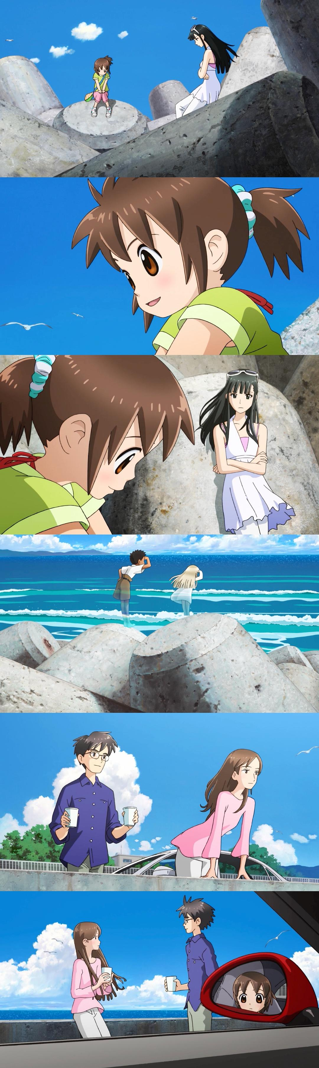 但一切随着剧情的发展在慢慢变化,很重要的一点是,铃鬼告诉所有人,时间要到了,什么的时间要到了?守护灵要升天了,小织你能看到守护灵的时间也要到了!成长的痛苦之一,就在于现实不断的入侵那个想象中的世界。因为现实,巨大的,残酷的,不可忽视的现实,就在那里。所以第三组客人的出现,与其说是巧合,不如说是成长必须面对的宿命。他们只是一个引子,引出的也是全片的高潮,也是最催泪的部分。最后是由小织的爸爸妈妈,“亲口”告诉小织,是的,我们已经不在了,但我们最高兴的是你还活着。