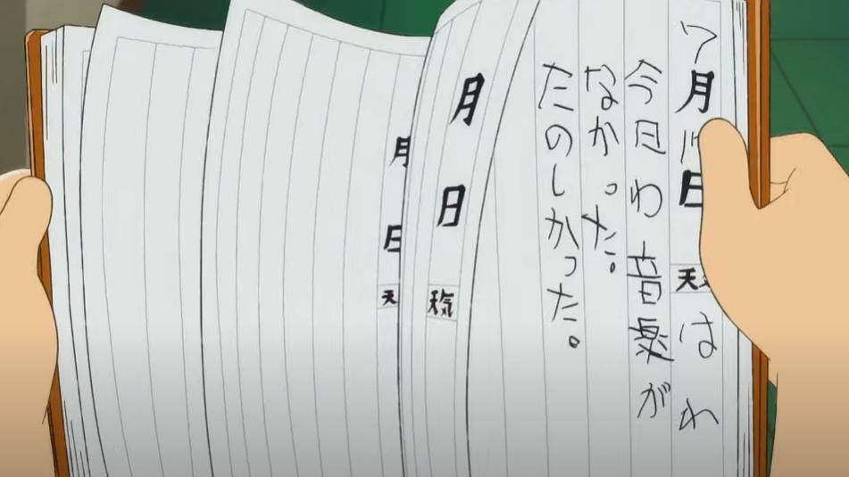 镜头一转,在大雄的书桌上,摊着大雄用“加速发条”匆忙完成的暑假作业,其中留到最后写的是暑假日记。或许是忙中有错,大雄把“预言日记本”当成了普通的日记本,在决战的那一天写下了:“今天和大家一起泡了澡,真开心。”预言日记本再次忠实执行了大雄不加任何限定的指令,拉着整个地球一起和大雄泡了个澡,而且让大雄感到很开心。