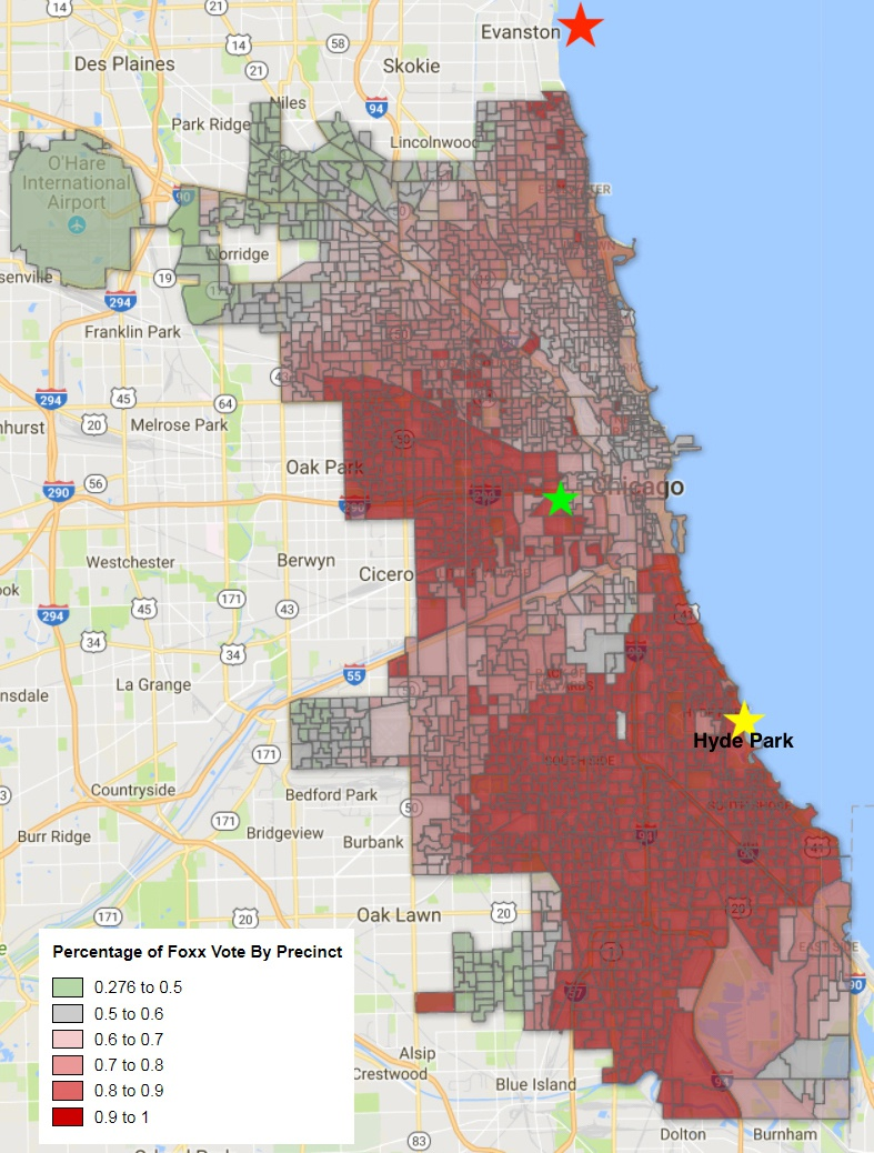 然鹅,lz住在,呵呵,海德园“Hyde Park”,(下图黄色星星),如果你仔细看,在芝加哥南部一片深红中,能找到一小片粉红色,对,那就是Hyde Park,它之所以为粉色而不是深红,是因为这里是芝加哥大学的校区,有着数量惊人的校园警察和报警柱,才勉强将大学周围区域维持在一个不是特别高的犯罪率水平。