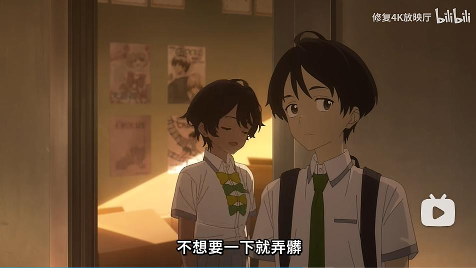 比起煽情到有点用力过猛的开头,更喜欢中间温水在学校的游荡。美术和演出上都非常强地刻画出了校园生活的氛围感。不少画面温水置于中后景,而前景是其他学生、器物等,温水的游荡被挡住,这一方面强化了主人公温水的游离气质,另一方面,展现出了某种仿佛独立于温水之外运作的校园生活的秩序。这似乎也是和目前动画表现的主题(不是“党争”,而是党争之后的,快刀斩乱麻地释怀,人际关系中的重建)相一致的。更暴论的想法是,在9:03,视线被游荡着的温水带着,转移到了无名微笑的少女身体上——这段几近一个对这部片的提喻。