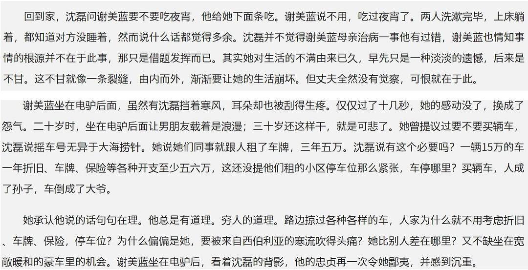 谢美蓝当然不是完美的。她一直都是一个需要丈夫的依靠的传统妻子,即使掌握着家里的经济却仍要在买车换房的大事上遵从丈夫的主意。她有她道德的坚持,也有她人性的弱点,她明确拒绝了上司,也接受了他出于私心的帮助。我想编剧设计这一情节只是出于对谢美蓝的恶意,但是有一个人,她看到了一个女性面对满目疮痍的生活时的不安与挣扎,在面对自己所欲所求时的坚定与懦弱,面对道德困境时的忠贞与妥协。