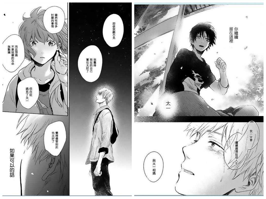 我开始不理解为什么半年不见面也不联系,漫画里,太一是希望在他的努力下世界变得更好,航平能无所顾忌的大声说笑。航平则是有点胆怯,但是决定如果春天到了一定要去见他。