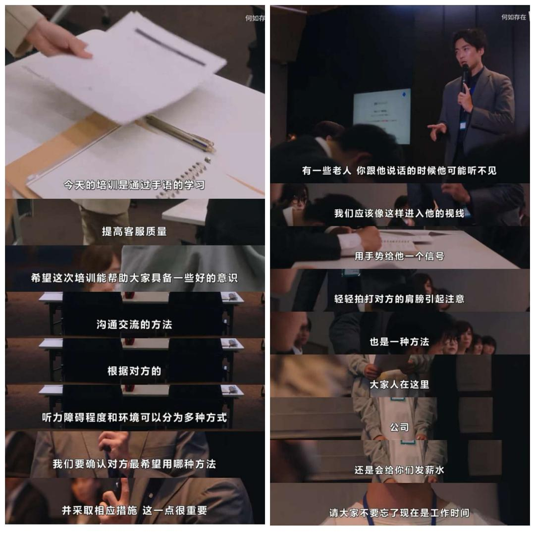 跟着偶然撞到的社长进到公司之后的戏份就是重点了,弹幕上的争议也挺多,其实社长是乐观且包容的人,善于倾听。他们最开始讨论的分歧就在于正常人,听障人士,聋哑人划分服务。社长公司主要针对的还是聋哑人,太一的点在于有听力但是不会手语的听障人士能不能获得服务或者说平等对待。对比着航平和真也聊天时其他同学的私语,偏见还是存在。