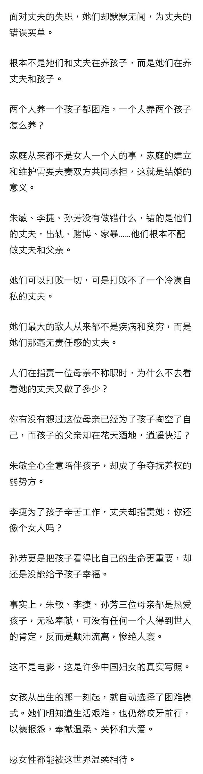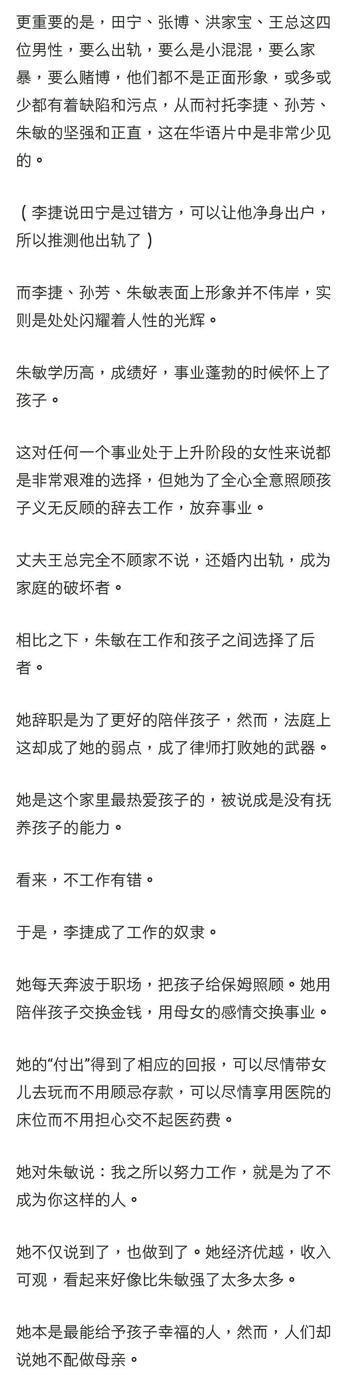 这部电影中的第三母亲,只有寥寥几个侧写。她叫朱敏,是李捷一个离婚案委托人的前妻,同样在争孩子的抚养权。她学历不低,可是为了照顾孩子和家庭,结婚后就一直没上班,被人称为“王总”的老公,没有后顾之忧,事业发展得风生水起,在外面有了别的女人。