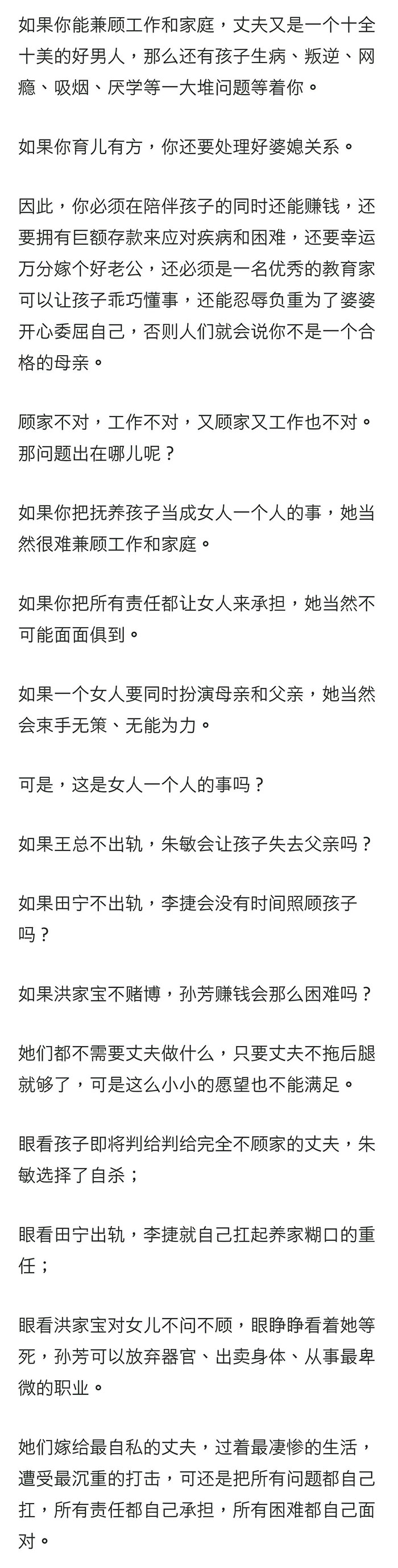 好吧,你当了全职太太。每天一睁眼就跟打仗一样,伺候好小的和老的,家务活全包,日复一日的鸡零狗碎,熬黄了脸,累弯了腰,转过头男人就出了轨。如果忍不下这口气,非要离婚,自己没收入没存款,别说孩子的抚养权争不到,脱离职场这么久,找工作都成问题。
