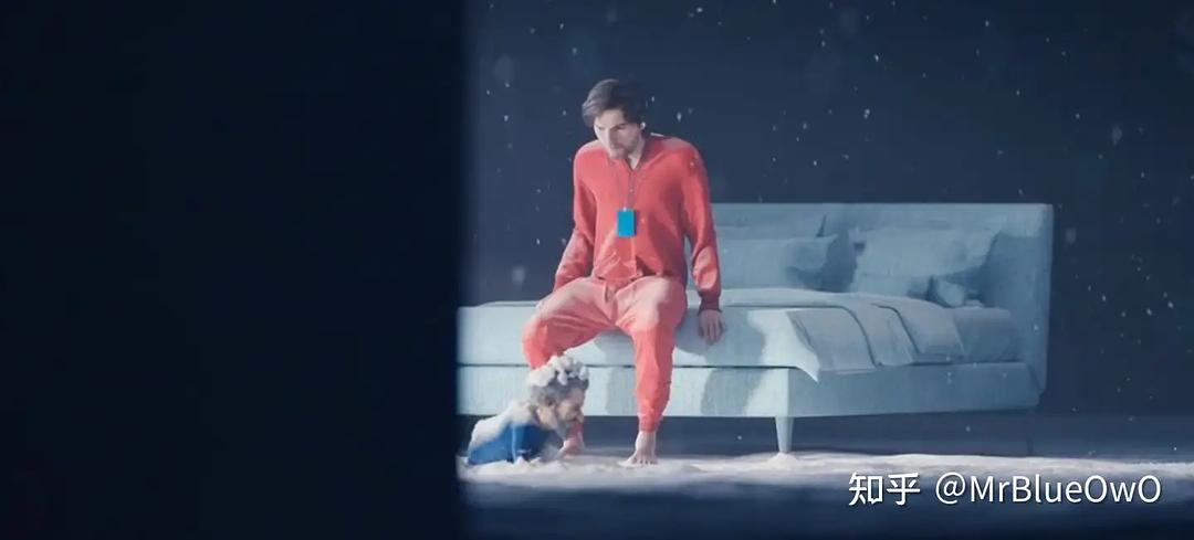 7、根据树木高度以及走上楼梯,现在大约是在三楼。仔细看海伦娜·伊根的衣着,是去卢蒙公司分离楼层上班的工装。暗示今天是工作日,现在的时间是早上上班之前,即海伦娜·伊根早起先游泳健身,然后沐浴更衣,再跟她爸杰姆·伊根共进早餐,最后才由司机送去上班。想当年,我刚步入社会成为打工人,听同事说我们公司老总早上起来要洗澡,让我大为震惊!我说人家的头发怎么不像我一样油呢,我通常是晚上洗澡第二天起床准是大油头。所以我也想早上洗澡。我妈就骂我有病!后来,我搬出来自己租房住了。可一直到如今一把年纪了,我都没有实现早起洗澡的自由。为啥呢?因为这不光是洗澡那么简单,人家还健身呢,有人替你准备好早餐呢,有人替你照顾好孩子爪子呢,不用挤公交地铁骑电驴呢,甚至都不用打卡呢。我说的这些不全是废话,跟《人生切割术》有点关系,马克·斯科特,海伦娜·伊根,欧文·贝利夫,迪伦·乔治,他们原本分属于不同的社会阶级,只有在“记忆分离手术后”,只有在卢蒙公司的分离楼层的宏观数据精检部里,才会“平起平坐”,才会“同工不同酬”,才会“有所谓的同事情谊”。但正是由于那场紧急加班的事故,导致了这个“原本封闭的和谐环境”被外界“入侵”,其中带有“社会上流身份”的赫莉R变成了“搅屎棍儿”!