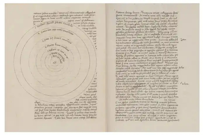 哥白尼手稿nn《天体运行论》的手稿,哥白尼用拉丁文写成,动画约兰达使用的语言是波兰语,是不符合历史的。应为拉丁语是一种成熟的语言,但是各民族语言还在成长阶段,科学领域的书主要还是用拉丁语表达准确,别说哥白尼,就是更后来的笛卡尔也使用拉丁语写作。波兰语的成熟要等到16世纪晚期,17世纪早期。n1543年首版《天体运行论》纽伦堡版,字体是罗马字体。