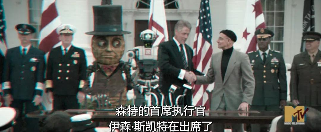 镜头一转,时间已经到了“过去”(故事这点的设定,还是相当有意思的,一本正经在讲已经发生过,但其实又没发生的事儿),老外那旮旯已经用机器人工作了。