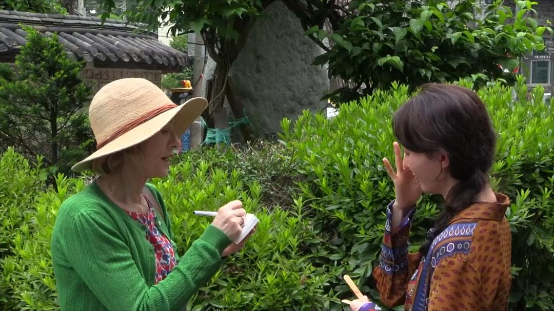 作为旅行者的Iris,穿着红蓝相间的碎花裙,披着绿色的针织开衫,戴一顶卡其色的编织帽。一个法国人,在韩国一个不知名的地方,全然陌生,需要不断地让自己实体化。一方面,我们看到她进食、踩水、睡眠以及获取酬劳,这些构成了“旅行者的需求”,也如她自己所言,在异国他乡逐渐找到存续的倚靠。另一方面,Iris与周遭环境在影像层面互相作用:她似乎在某些时刻成为了环境的一部分,又在某些时刻从环境中分离出去——好像她可以在空气中散落成无数的基本粒子,去充盈整个环境,再汲取灵力让这些粒子糅合成形,得以重生。在从仁国家离开之后,Iris来到一处天台,这里布满了绿色,她突然踮起脚,跳起轻盈的舞步,如同在施展魔法。在既像融入环境又像改变环境的影像辩证之中,一种梦境般的场景降临,“绿色”以温和的姿态逐渐渗透进观众的虹膜(Iris的本义正是“虹膜”)。在旅行与拜访的空隙中,Iris成为了某种“回荡”,在粒子态与实体之间循环往复,将他人的语词转译再生成诗句。