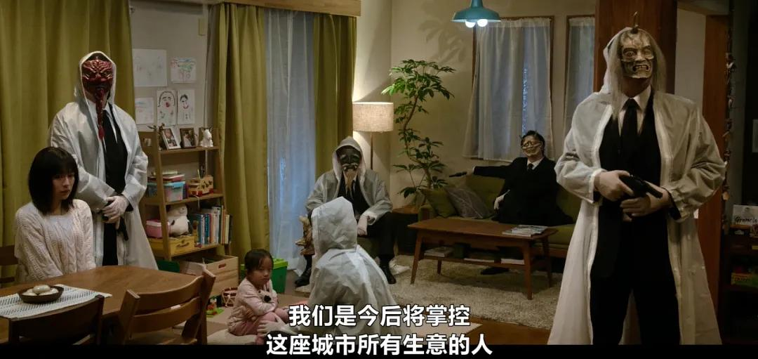 一伙戴着恐怖面具,拿着枪的人闯入家中,并用坂田妻女的性命威胁他,让他不敢反抗。