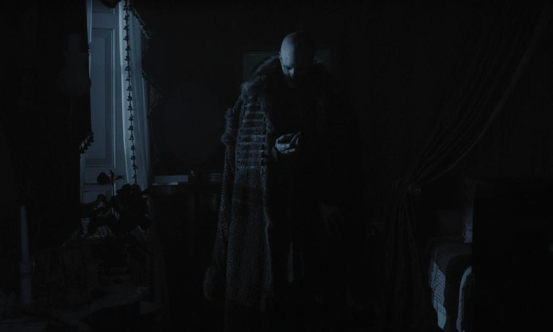 多次出现的黑暗转场,我个人倒是觉得有点频繁了。针对原版电影的阴影,罗伯特·艾格斯并没有选择一比一复刻,毕竟这没意思。所以电影中出现了更夸张惊骇的利爪穿越城市,奥洛克站在窗户前的正面镜头变成了背面。结局原本化灰或猝死的奥洛克,成为了枯槁可怖的吐血尸体。