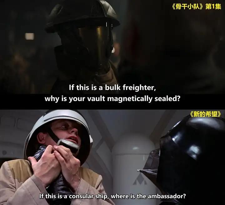相信星战迷们都看出来了。本剧开场分镜完全模仿1977年第一部《星球大战》电影,即《新的希望》的开场。连反派台词都大同小异。西尔沃船长(Captain Silvo)说:“如果这是艘散货船,那为什么你们的保险库被磁密封?”正如达斯·维德当年的台词:“如果这是艘领事船,那大使在哪儿?”
