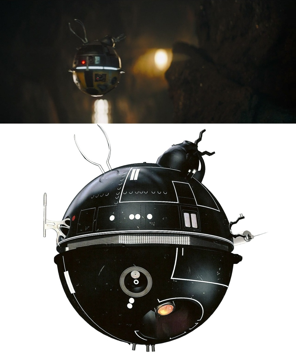 在牢房里飘浮过去的是一个IT-0刑讯机器人(IT-0 interrogator droid)。这种机器人最早是帝国用来审讯犯人的。在1977年第一部《星球大战》电影里,莱娅公主被达斯·维德俘虏时,就遭到这种机器人的审讯。