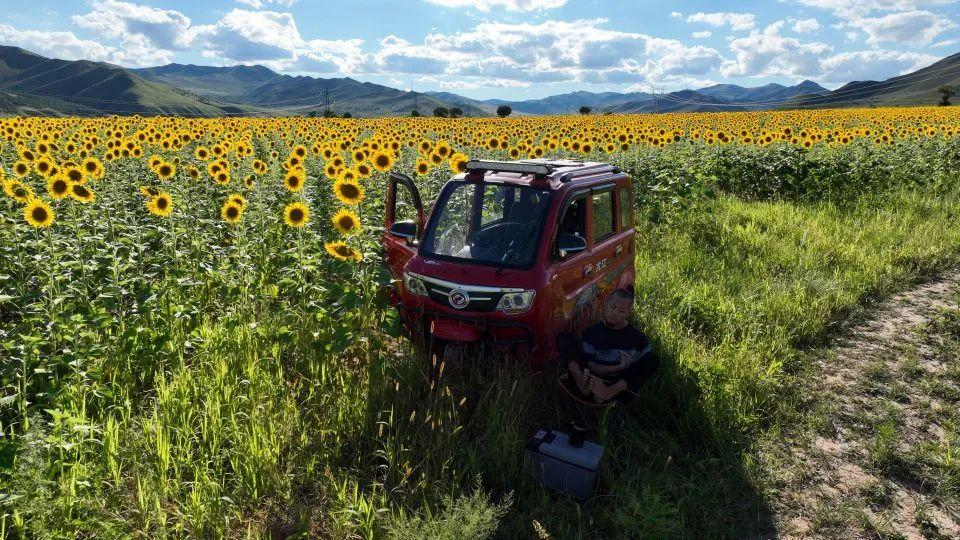 在向日葵花海中,他停了下来,细细的诉说自己的心路历程,“你们听了这么多,也累了吧,喝一点吧!”