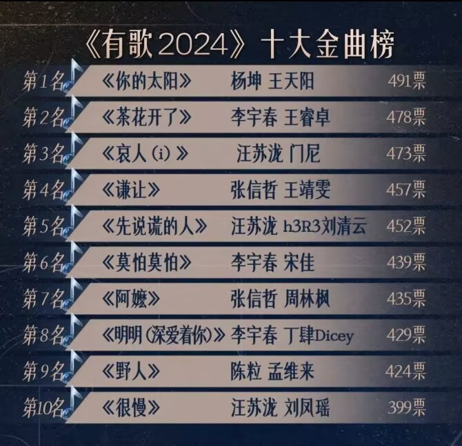然后再到快完结前,第十期踢馆赛如天神下凡,直接给前九期降维打击,这一期全是实力歌手表演,无论从歌手知名度、专业度还是歌曲质量上来讲,和前九期都不是一个层级。但最搞笑的是,这期没一首歌进入最终的十大金曲榜单,所以这期的意义是?退一步讲,这一期有两首在市场上已经比较成功《11》和《壁上观》,按大众审美而言成绩肯定不会差,结果排名垫底,呵呵,老歌就比不过新歌是吧?如果这档节目真心为了新歌服务,那安排这两首老歌进来是为了?这到底是《有歌2024》还是《没歌2024》?