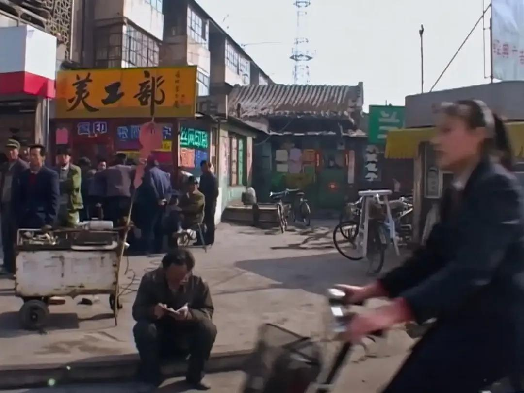 性病医院广告入镜,报亭、行人、三轮车、美工部,围聚下棋的老头,银行、站牌、路人,杂乱停放的小汽车,杂乱张贴的广告、标语和招牌。