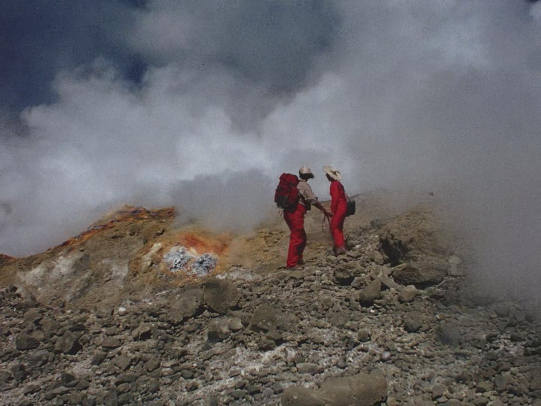 开场字幕一出现,就能感受到《火山挚恋》这部纪录片的与众不同。导演Sara Dosa拒绝向大家展示自己或其它主创的名字,而表示这部电影是“Katia, Marice and friends”一起拍摄的——的确,这是一部绝大多数影像都由数十年前的主角们拍摄,或由电视台采访他们的录像、与他们同行的伙伴们的摄影等内容构成的纪录片,由今人原创的大概只有中间插入的几段可爱动画。导演从两位主角留下的大量资料中挑选出精彩的部分剪辑在一起而已,在还原他们的人生轨迹的同时,也通过精巧的叙事设计、跨越时空阻隔的共情和对科学史的了解,出色的传达出了他们的抱负和数十年寻访火山之旅中的思想变化。《火山挚恋》远不止是烂番茄网站上影评人共识中形容的“一对有着奇异志趣伴侣的故事”或者“摄人自然摄影合辑”( “Whether as a story of one couple's quixotic quest or simply a stunning collection of nature footage, Fire of Love burns bright ”),还融入了(既来自于Katia和Marice,也来自于二十一世纪的导演和主创的)对生命与死亡的沉思、对人与自然关系的探求,以及对人类之爱的礼赞。