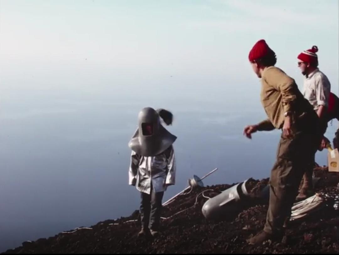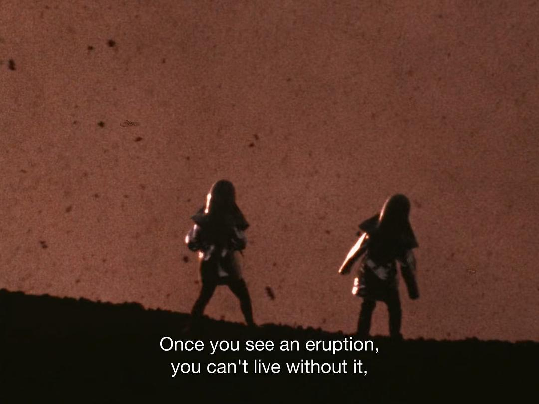 虽然火山长存,喷发不息,但是Katia与Marice这一代火山学家却是只有特定时期人类社会中才会出现的人物。战后相对和平安定的世界环境和迅速发展的航空运输让他们得以畅通无阻地前往世界各地追寻火山。电视文化的传播渠道让他们的个人形象和考察成果可以经常以动人的形象出现在世人眼前,收获社会支持与物质资助。便携摄影设备的普及让他们可以像新浪潮影人一样带着全套设备记录下火山与熔岩的形貌。即使在一个多小时的纪录片影像中,也能看出这对火山学家夫妇实际上是深受当时各种思潮影响的知识分子:无论是在极寒还是酷暑之中,Katia总是以一种几乎可以被称为时尚的方式出现在镜头前,而Marice则有意识(并充满爱意地)用电影摄影的方式捕捉下火山和妻子的精彩瞬间。他们就像在不断以不同方式、在不同极端环境下进行一场充满艺术和科学自觉的摄影实验,尝试捕捉自然的壮美。甚至有时还会玩性大发,留下致敬经典电影(荒野大镖客!)的影像。无论是被电视台采访的Marice,还是笔耕不辍写下众多日志的Katia,都流露出对存在主义哲学的了解(甚至,这种哲学可能指导了他们的人生)。和战后一代的众多青年一样,他们反对战争、歧视与结构性的压迫,为了声援越南人民共同走上街头。正是出于对“人类的节律”(rhythm of human)的不满与幻灭,他们才转向探索“地球的节律”(rhythm of Earth),从中发现科学规律和永恒的美。连他们的生活方式也带着时代的印记——即使在法国,在这一代人之前,有多少人能够完全挣脱家庭、传统与职业的束缚,成为这样四处漂泊的自由职业者呢?