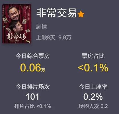 电影上映8天,票房不足十万,最低单日票房600元,连主演吃顿饭都不够吧?