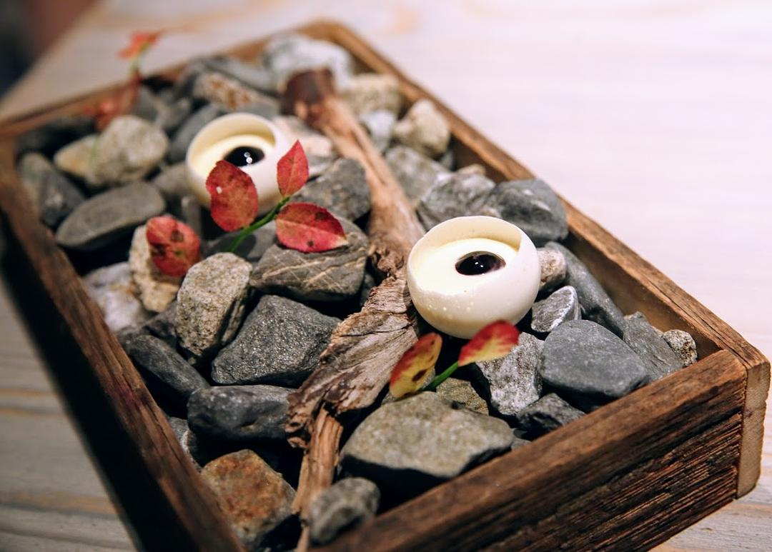 这大概也是Faviken视觉惊艳的一道名菜了,Magnus说他从古书中发掘出来的。开始以为应该大概就是鹌鹑皮蛋,但是又略有不同,因为壳处理很软,是溏心的。