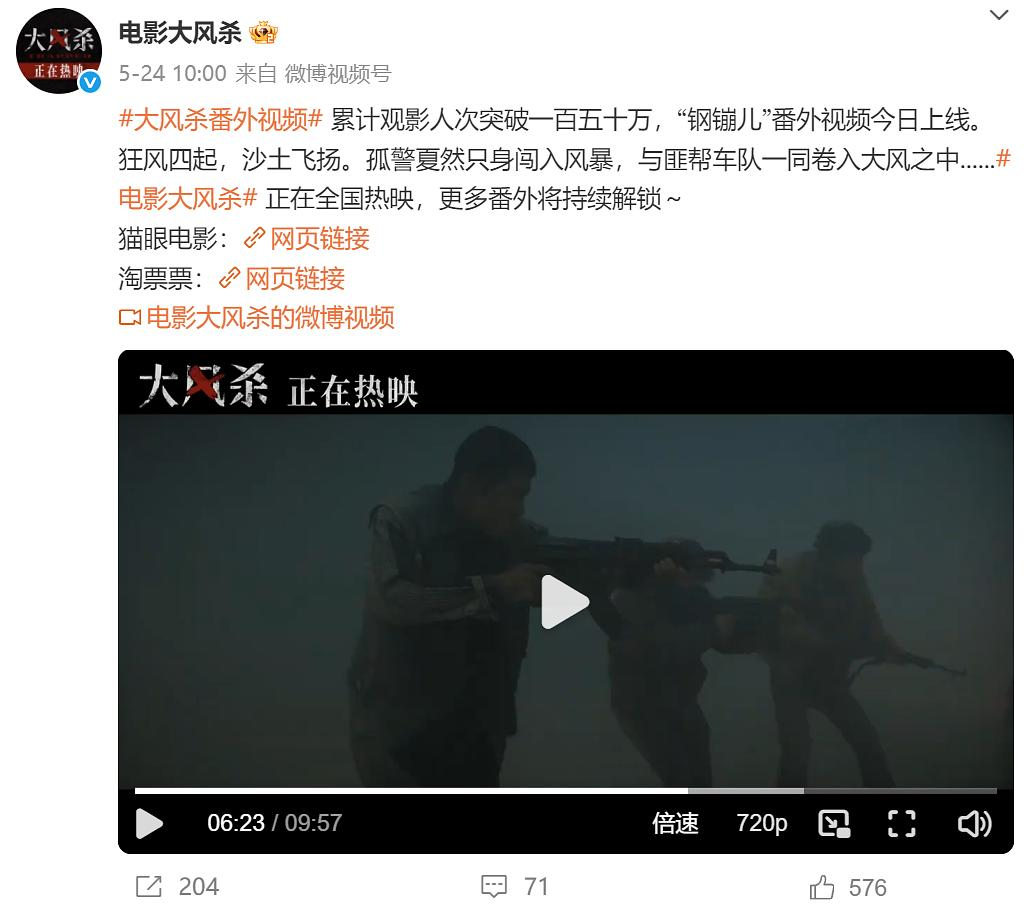 另外,大风杀官方微博放出了影片删减的5条番外篇,其中第五篇是长达10分钟的夏然在大风暴里如何利用大风打败钢镚等匪徒的枪战戏!加上这段戏枪战就合理多了,这段被删减实在太可惜。不知道导演和剪辑删掉这段是出于片长原因,还是不想让夏然太“兵王”?