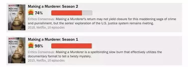 《制造杀人犯》第二季上线后吸引了很多中外观众,但不管是在烂番茄还是豆瓣上,评分较第一季都有所下滑。或许其中很大一部分原因在于,第二季并没有给出案件实质性的进展,更像一份凯瑟琳搜集上诉证据的报告。