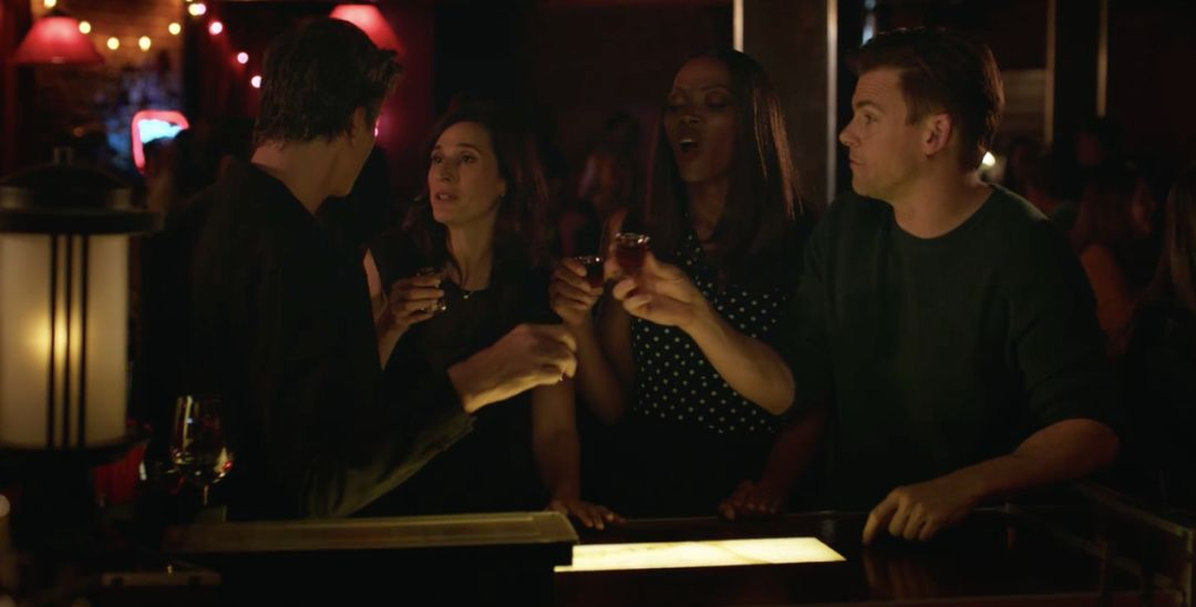 Alex为了让她可以自然地在酒吧遇见对方,特地拉上Leon、还有另外两个女生在同一个酒吧里喝酒聊天,这样Valerie既可以遇见Jennifer又不至于过于刻意,真的是超级超级高中生桥段。