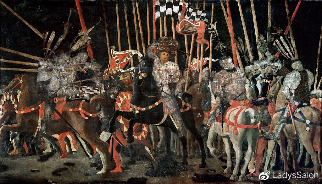 这幅画其实是一个系列画中的一员。这个系列名叫圣罗曼诺之战(The Battle of San Romano),一共有三幅,画家是Paolo Uccello。