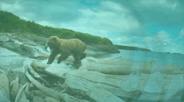 孩子为了从坡上转移到河边,硬是豁出整个身体,连翻几个跟头最后稳稳落地,把旁边围观的灰熊都惊呆了。