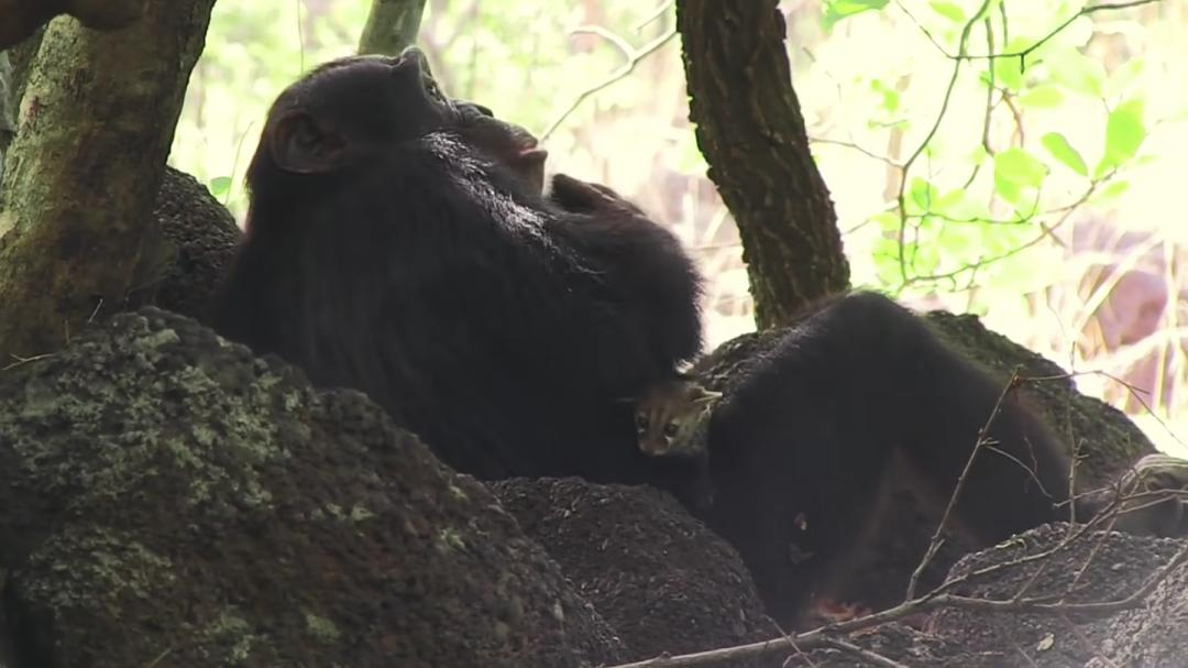 一只成年黑猩猩收养了一只被遗弃的小香猫,它保护着这只小香猫,不让其他黑猩猩欺负它。